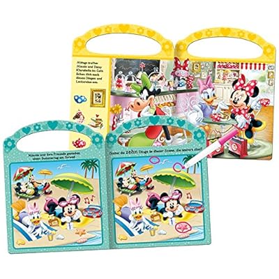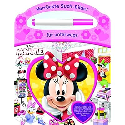 Verrückte Such-Bilder für unterwegs, das sind 28 Seiten Such-Bilder, Such-Aufgaben und finde die Unterschiede mit Minnie und ihren Freunden im praktischen Buch mit Tragegriff, Stift und abwischbaren Seiten. Finde die Unterschiede und kreis sie ein. Dann wisch die Seiten sauber und spiel noch einmal! Pappbilderbuch mit Tafelschreiber und abwischbaren Seiten, Cover mit Prägung und Titelfolie, 28 Seiten, farbig illustriert